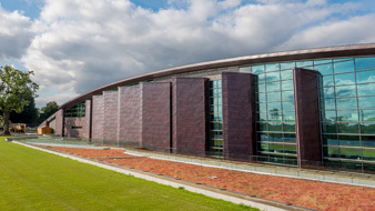 Sited on green-belt land, the scheme demanded a sensitive architectural approach to ensure minimum visual impact in the landscape. The original building accommodates the latest training, rehabilitation, medical and media technology facilities and its elevational treatment uses brass shingle cladding, natural coloured render, and Technal's GEODE-MX Trame Horizontale curtain walling.