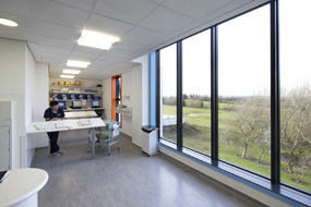 Fabricated and installed by Dortech Architectural Systems, each 1.2m by 2.4m glazing unit was created using MX SSG structural glazing with a fixed pane and a concealed top hung vent above. The MX curtain walling system was also used for the full height glazing to two stairwells and for the nurse stations on each floor.